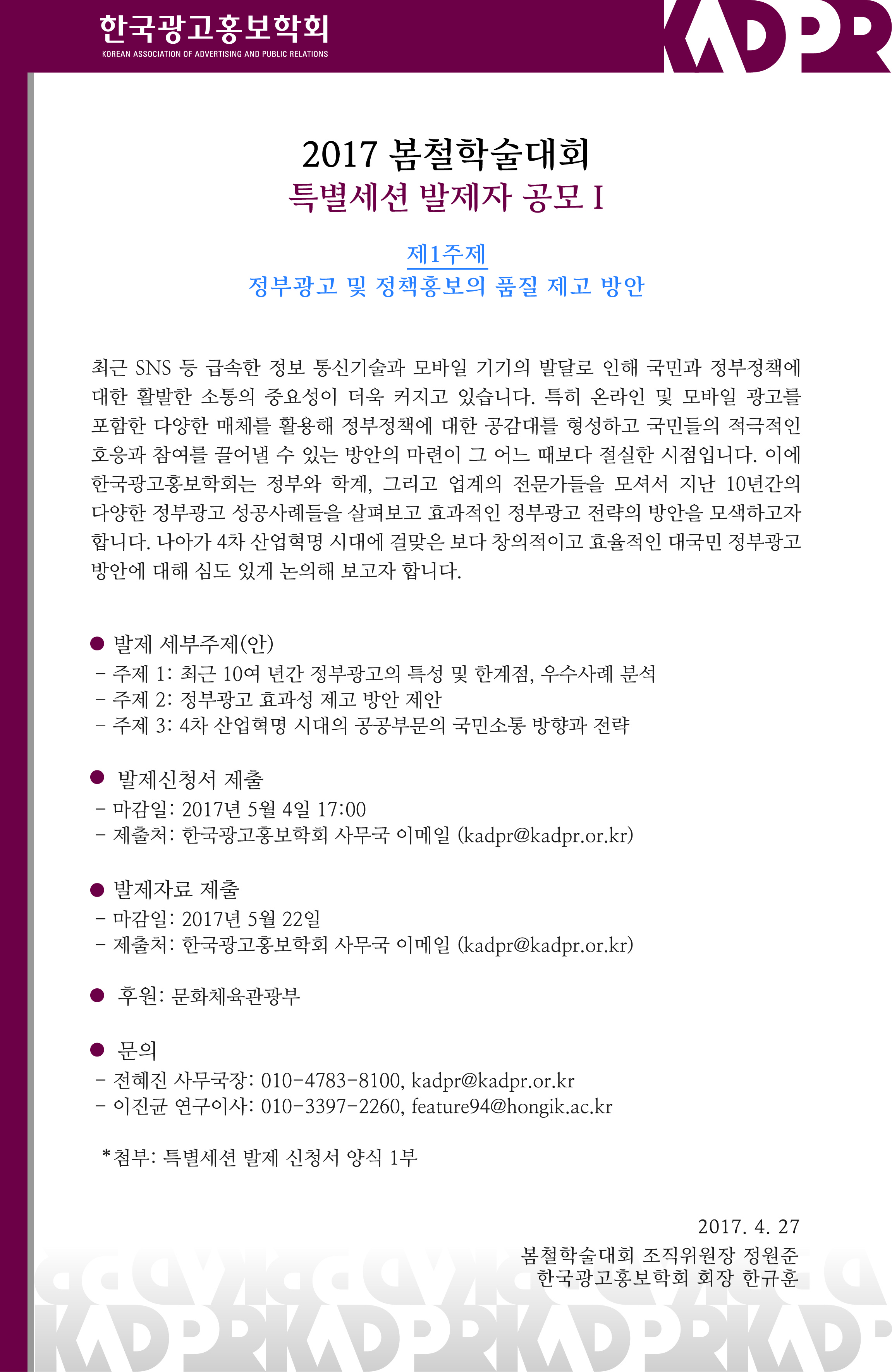 2017 봄철학술대회 특별세션 I 발제자 공모 (정부광고 및 정책홍보의 품질 제고 방안)