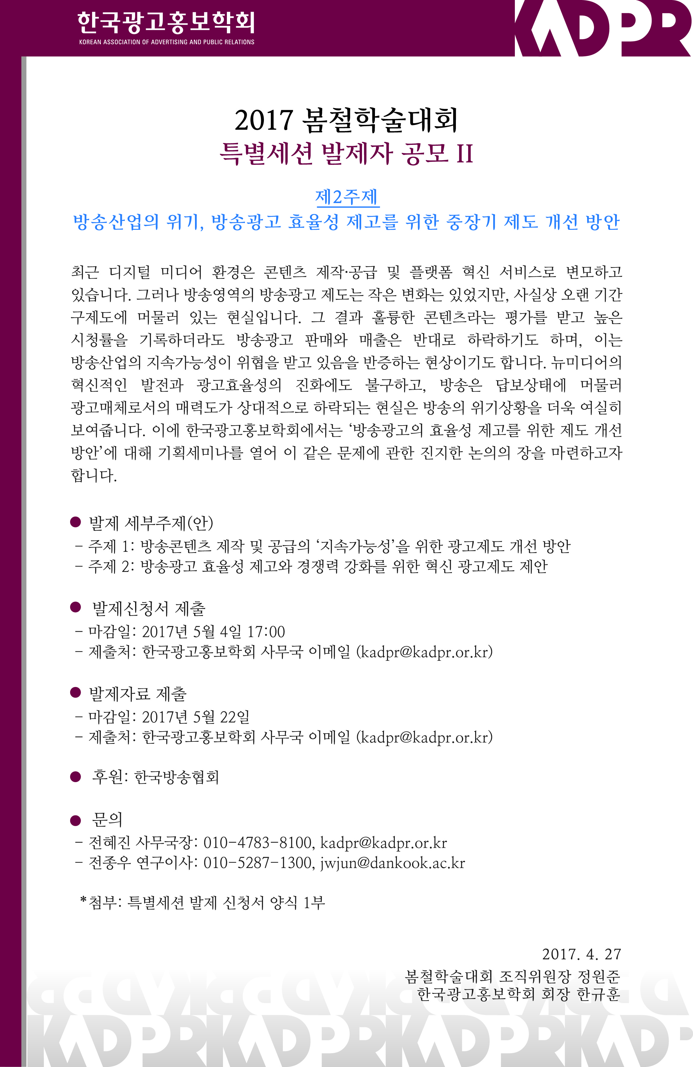2017 봄철학술대회 특별세션 III 발제자 공모 (방송광고 발전을 위한 미디어렙 정책 제안)