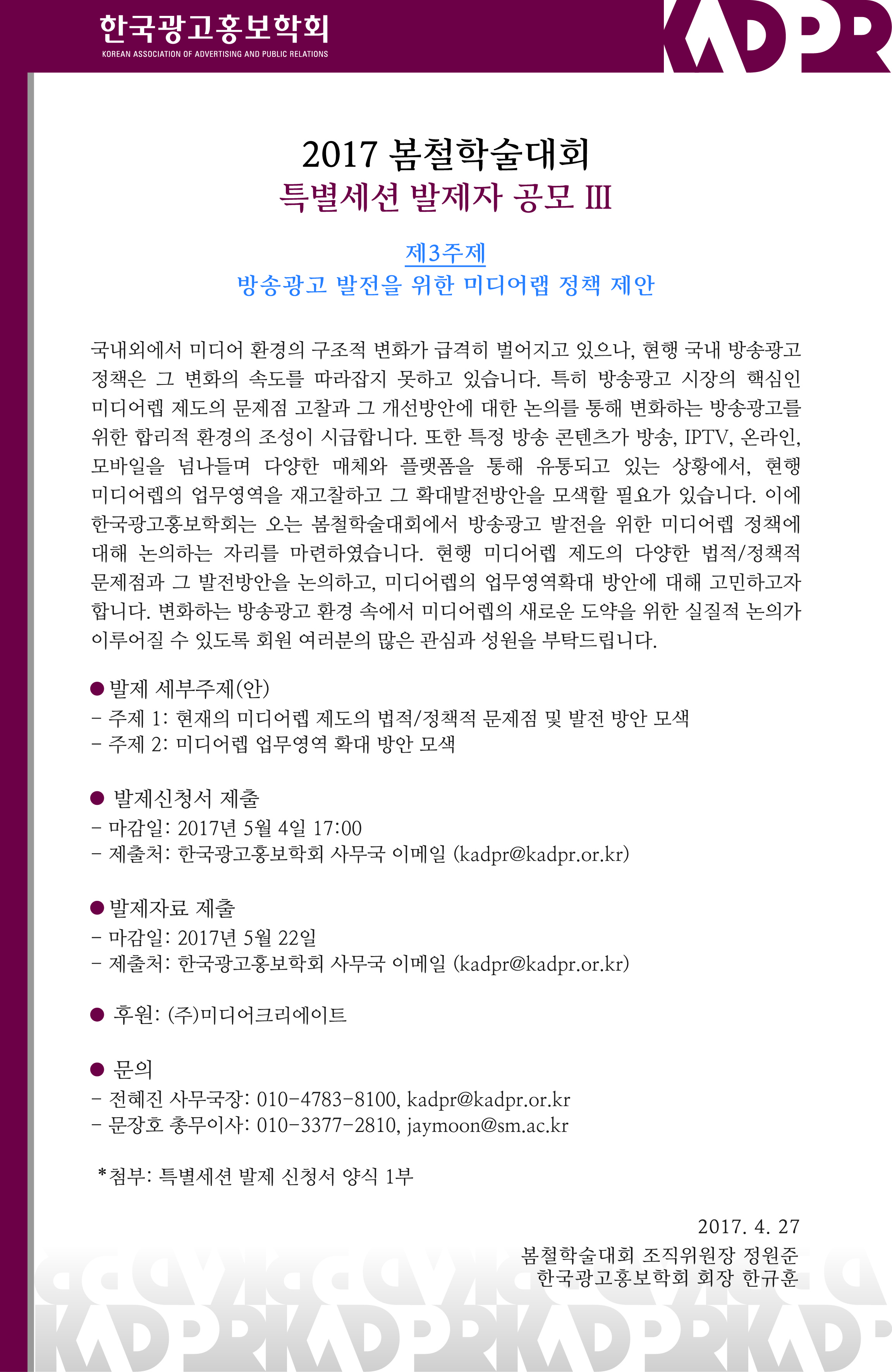 2017 봄철학술대회 특별세션 III 발제자 공모 (방송광고 발전을 위한 미디어렙 정책 제안)