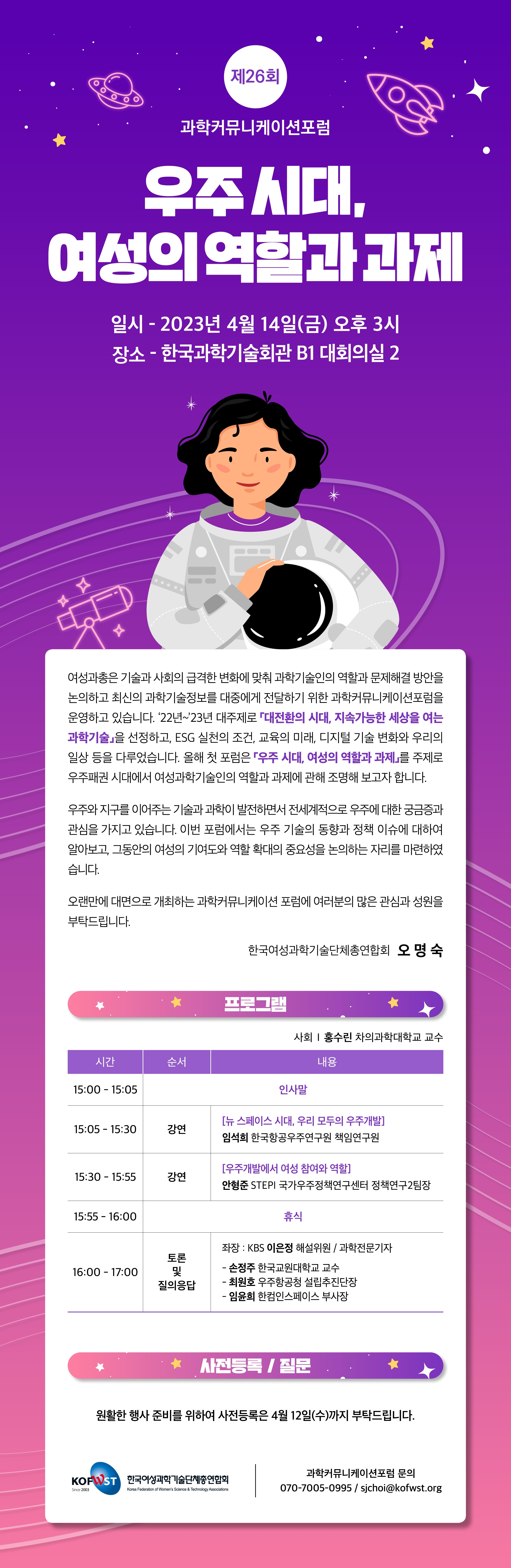 여성과총 : 제26회 과학커뮤니케이션포럼 초대 - '우주 시대, 여성의 역할과 과제'
