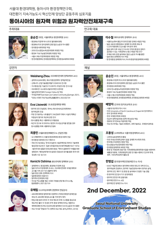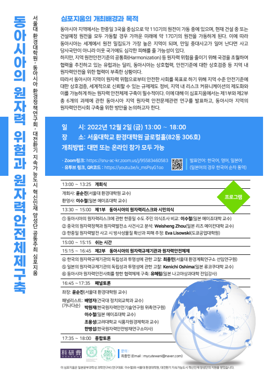 동아시아 환경정책연구회와 서울대 환경대학원 공동 주최로 '동아시아 원자력 위험과 원자력안전체제 구축' 심포지움을 개최합니다.