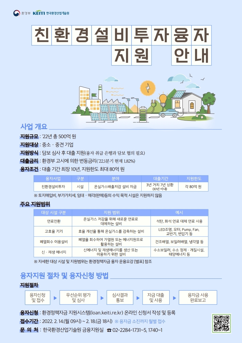 이에 따라, '22년도 친환경설비투자(융자) 사업 2월 공고 사항을 안내하오니