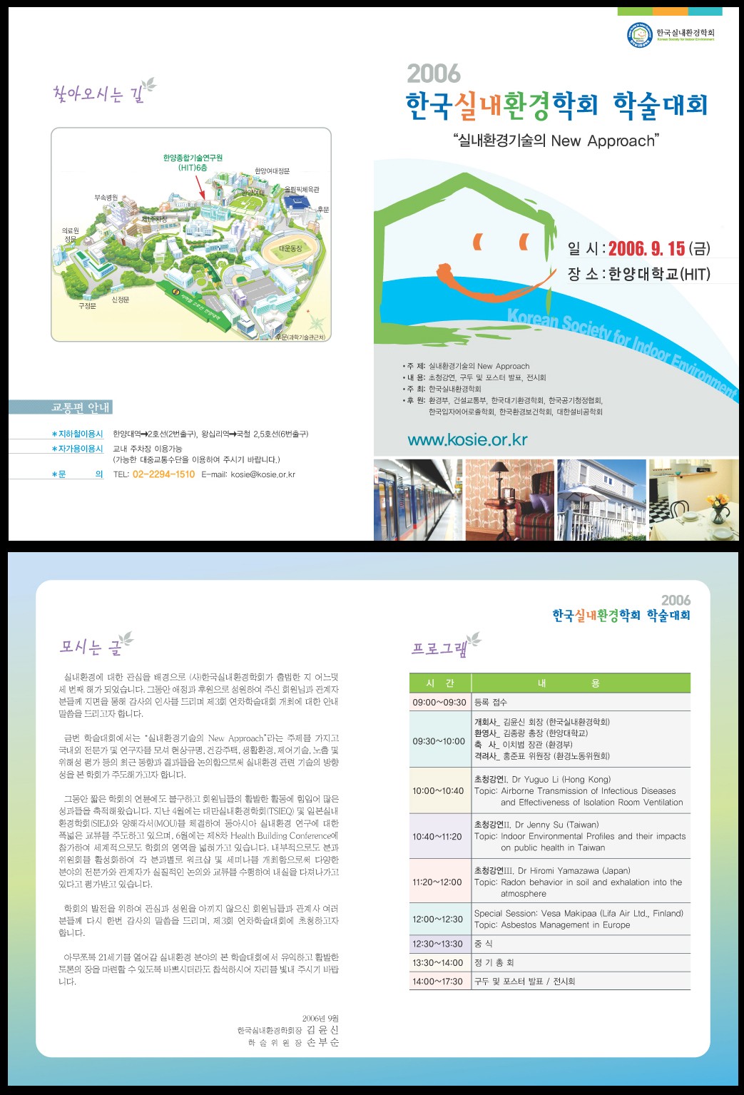 | 2006년도 한국실내환경학회 학술대회 안내 발표논문 및 선등록 마감: 2006년 8월 25일(금) ◆ 주제 : '실내환경기술의 New Approach' ◆ 일시 : 2006년 9월 15일 (금) 오전 9시~오후 5시 30분 ◆ 장소 : 한양대학교 HIT(6층) ◆ 내용 : 구두 및 포스터 발표, 초청강연, 전시회 ◆ 후원 : 환경부, 건설교통부, 한국대기환경학회, 한국공기청정협회, 한국입자에어로졸학회, 한국환경보건학회, 대한설비공학회 ■ 프로그램 (최종) ※오후 프로그램 일정이 일부 변경 되었으니 확인하시기 바랍니다. 시 간 내 용 09:00-09:30 등록 접수 09:30-10:00 개회사 / 김윤신 회장 (한국실내환경학회) 환영사 / 김종량 총장 (한양대학교) 축사 / 이치범 장관 (환경부) 격려사 / 홍준표 위원장 (환경노동위원회) 10:00-10:40 초청강연 I. Dr Yuguo Li (Hong Kong) Topic: Airborne Transmission of Infectious Diseases and Effectiveness of Isolation Room Ventilation 10:40-11:20 초청강연 II. Dr Jenny Su (Taiwan) Topic: Indoor Environmental Profiles and their impacts on public health in Taiwan 11:20-12:00 초청강연 III. Dr Hiromi Yamazawa (Japan) Topic: Radon behavior in soil and exhalation into the atmosphere 12:00-12:30 Special Session. Vesa Makipaa (Lifa Air Ltd., Finland) Topic: Asbestos Management in Europe 12:30-13:30 중 식 13:30-14:00 정 기 총 회 14:00-17:30 구두 및 포스터 발표 / 전시회 ■ 학회지 3권 1,2호 배부 학회지 3권 1호와 2호를 학술대회 당일 행사장에서 배부해 드릴 예정이오니 회원 여러분께 서는 학술대회에 참가하셔서 수령하시기 바랍니다. ■ 협찬사 및 전시회사 모집 안내 이번 학술대회에 협찬이나 전시회에 참가하시고자 하는 기업은 학회 사무국으로 참가신청서를 8월25일 금요일까지 제출하여 주시기 바랍니다. (입금 기한: 2006년 8월 25일(금)까지) ■ 발표논문 접수 학술대회 논문원고(full paper) 접수 마감: 2006년 8월 25일(금) 홈페이지를 통하여 접수 시 같은 논문에 대하여 단 1회만 접수 받습니다. 충분히 검토하신 후 제출해 주시기 바라며, 논문 분량은 A4용지 4쪽이 원칙입니다. 자세한 내용은 학회 홈페이지 발표논문안내 를 참조하십시오. 발표논문접수 바로가기 ■ 선등록 접수 우리 학회에서는 학술대회 참가신청을 선등록 제도로 시행합니다. 선등록 하신 분께는 행사 당일 등록비보다 일반 10,000원(학생 5,000원) 이 할인되오니, 가능한 선등록을 하셔서 원 활한 행사 진행이 되도록 협조하여 주시기 바랍니다. 가. 마감일: 2006년 8월 25일(금) 나. 신청방법: 학회 홈페이지에서 선등록접수 바로가기 다. 선등록비 납부방법: 학회계좌로 송금 또는 홈페이지상에서 온라인 카드결재 은행명 계좌번호 예금주 신한은행(구조흥은행) 597-01-016690 사단법인한국실내환경학회 라. 등록비 (중식 및 논문집 포함) 구분 선등록비 현장등록비 일반등록 회원 (2006년도 연회비 납부자에 한함) 30,000원 40,000원 비회원 40,000원 50,000원 학생등록 15,000원 20,000원 ■ 기타 자세한 사항은 학회 홈페이지(www.kosie.or.kr)를 참조하시기 바랍니다. |